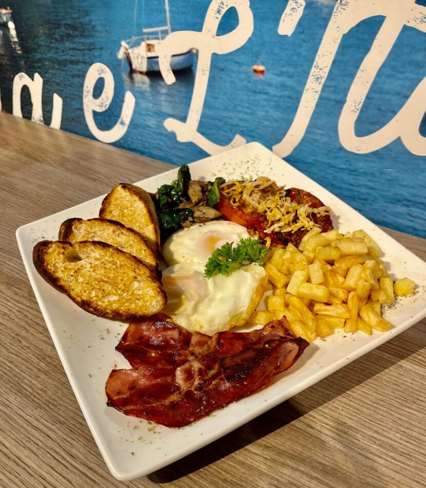 huevos fritos, espinacas con champiñones, tomates grillados, tocino con hash browns y bagett tostado.